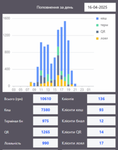 Єдина інформація яка не враховується і не показується тут – це поповнення карт лояльності безготівковим перерахунком з терміналу, ця інформація відображається у таблиці Термінал.