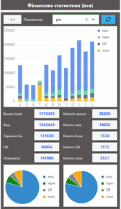 Сторінка Фінансова статистика (все) показує статистику поповнення готівкою (кеш), з банківською картою з терміналу (терм), картою лояльності (лоял), за QR-посиланням (QR).