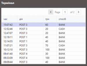 Сторінка Журнал по терміналу відображає усі транзакції по терміналу за вибраний день. На цю сторінку можна перейти зі сторінки фінансовий контроль, натиснувши кнопку Термінал. Сторінка містить таблицю з записами, та сумарні значення.